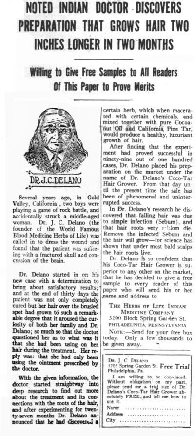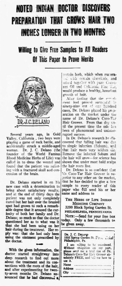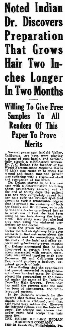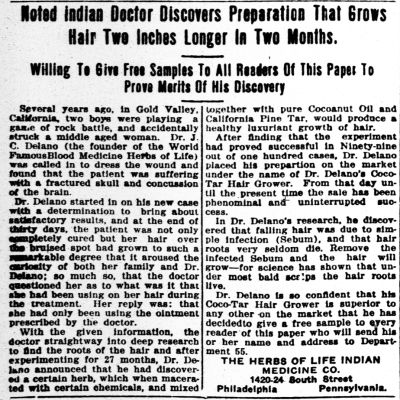 "Several years ago, in Gold Valley, California, two boys were playing a game of rock battle, and accidentally struck a middle-aged woman. Dr. J. C. Delano (the founder of the World Famous Blood Medicine Herbs of Life) was called in to dress the wound and found that the patient was suffering with a fractured skull and concussion of the brain. Dr. Delano started in on his new case with a determination to bring about satisfactory results; and at the end of thirty days the patient was not only completely cured but her hair over the bruised spot had grown to such a remarkable degree that it aroused the curiosity of both her family and Dr. Delano; so much so that the doctor questioned her as to what was it that she had been using on her hair during the treatment. Her reply was that she had only been using the ointment prescribed by the doctor. With the given information, the doctor started straightway into deep research to find out more about the treatment and its connections with the roots of the hair, and after experimenting for twenty-seven months Dr. Delano announced that he had discovered a certain herb, which when macerated with certain chemicals, and mixed together with pure Cocoanut Oil and California Pine Tar, would produce a healthy, luxuriant growth of hair. After finding that the experiment had proved successful in ninety-nine out of one hundred cases, Dr. Delano placed his preparation on the market under the name of Dr. Delano's Coco-Tar Hair Grower. From that day until the present time the sale has been of phenomenal and uninterrupted success. In Dr. Delano's research he discovered that falling hair was due to simple infection (Sebum), and that hair roots very seldom die. Remove the infected Sebum and the hair will grow, for science has shown that under most bald scalps the hair roots live. Dr. Delano is so confident that his Coco-Tar Hair Grower is superior to any other on the market that he has decided to give a free sample to every reader of this paper who will send his or her name and address to Department 55. THE HERBS OF LIFE INDIAN MEDICINE CO. 1420-24 South Street Philadelphia Pennsylvania."