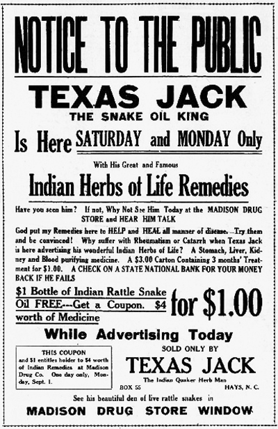 Notice to the public: Texas Jack, the Snake Oil King, is here, Saturday and Monday only with His Great and Famous Indian Herbs of Life Remedies. Have you seen him? If not, Why Not See Him Today at the Madison Drug Store and hear him talk. God put my remedies here to HELP and HEAL all manner of disease -- Try them and be convinced! Why suffer Rheumatism or Catarrh when Texas Jack is here advertising his wonderful Indian Herbs of Life? A Stomach, Liver, Kidney and Blood purifying medicine. A $3.00 Carton Containing 3 months' Treatment for $1.00. A check on a State National Bank for your money back if he fails. $1 Bottle of Indian Rattle Snake Oil FREE -- Get a Coupon. $4 worth of Medicine for $1.00 While Advertising Today. Sold only by Texas Jack, The Indian Quaker Herb Man, Box 55, Hays, N.C. This coupon and $1 entitles holder to $4 work of Indian Remedies at Madison Drug Co. One day only, Monday, Sept. 1. See his beautiful den of live rattle snakes in Madison Drug Store Window.