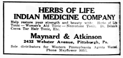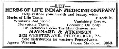 Herbs of Life Indian Medicine Company, Maynard and Atkinson Sole Distributors for Western Pennsylvania: their offices were at 2432 Webster Avenue, Pittsburgh, Pennsylvania. In other words, while Dr. E. P. Read was Dr. Delano's agent in the African-American community of Philadelphia, Maynard and Atkinson were his agents in Pittsburgh.