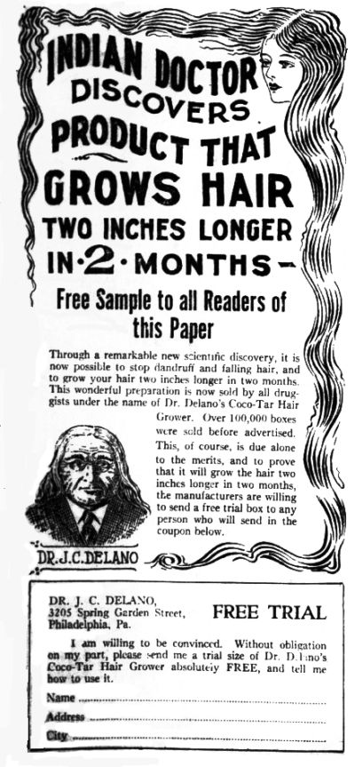 "Indian Doctor Discovers Product that Grows Hair Two Inches Longer in 2 Months. Free Sample to all Readers of this Paper. Through a remarkable new scientific discovery, it is now possible to stop dandruff and falling hair and to grow your hair two inches longer in two months. This wonderful preparation is now sold by all druggists under the name of Dr. Delano's Coco-Tar Hair Grower. Over 100,000 boxes were sold before advertised. This, of course, is due to the merits, and to prove that it will grow the hair two inches longer in two months, the manufacturers are willing to send a free trial box to any person who will send in the coupon below. DR. J. C. DELANO, 3205 Spring Garden Street, Philadelphia, Pa. FREE TRIAL. I am willing to be convinced. Without obligation on my part, please send me a trial size of Dr. Delano's Coco-Tar Hair Grower absolutely FREE, and tell me how to use it."